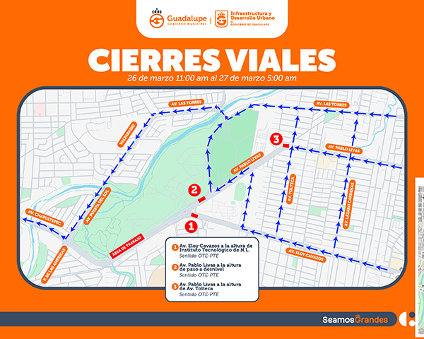 Entre las vialidades con cierres se encuentran la avenida Eloy Cavazos, frente al Instituto Tecnológico de Nuevo León, y la avenida Pablo Livas, tanto en el paso a desnivel como en el cruce con avenida Tolteca.