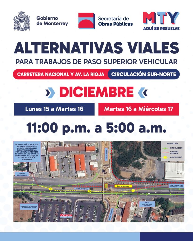 Para continuar con los trabajos del Circuito Vial Huajuco, el municipio de Monterrey anunció restricciones a la circulación vehicular así como la implementación de un carril de contraflujo durante las noches a partir del lunes 15 de diciembre en la Carretera Nacional.
