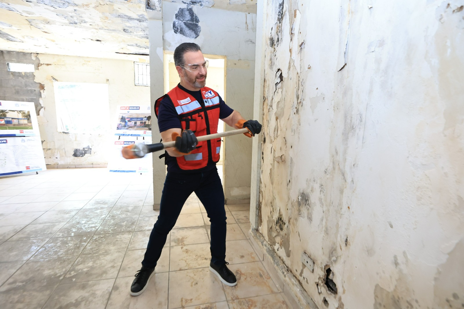 El alcalde Adrián de la Garza Santos, acompañado por su esposa Gaby Oyervides González, presidenta del DIF Monterrey, realizó las primeras labores de demolición en el Centro DIF Sierra Ventana, como arranque de los trabajos simultáneos.
