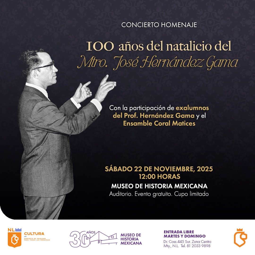 El Museo de Historia Mexicana y la Universidad de Monterrey, a través del su Departamento de Humanidades, invitan al homenaje “100 años del natalicio del Mtro. José Hernández Gama” el sábado 22 de noviembre a las 12:00 horas, el auditorio de este museo.